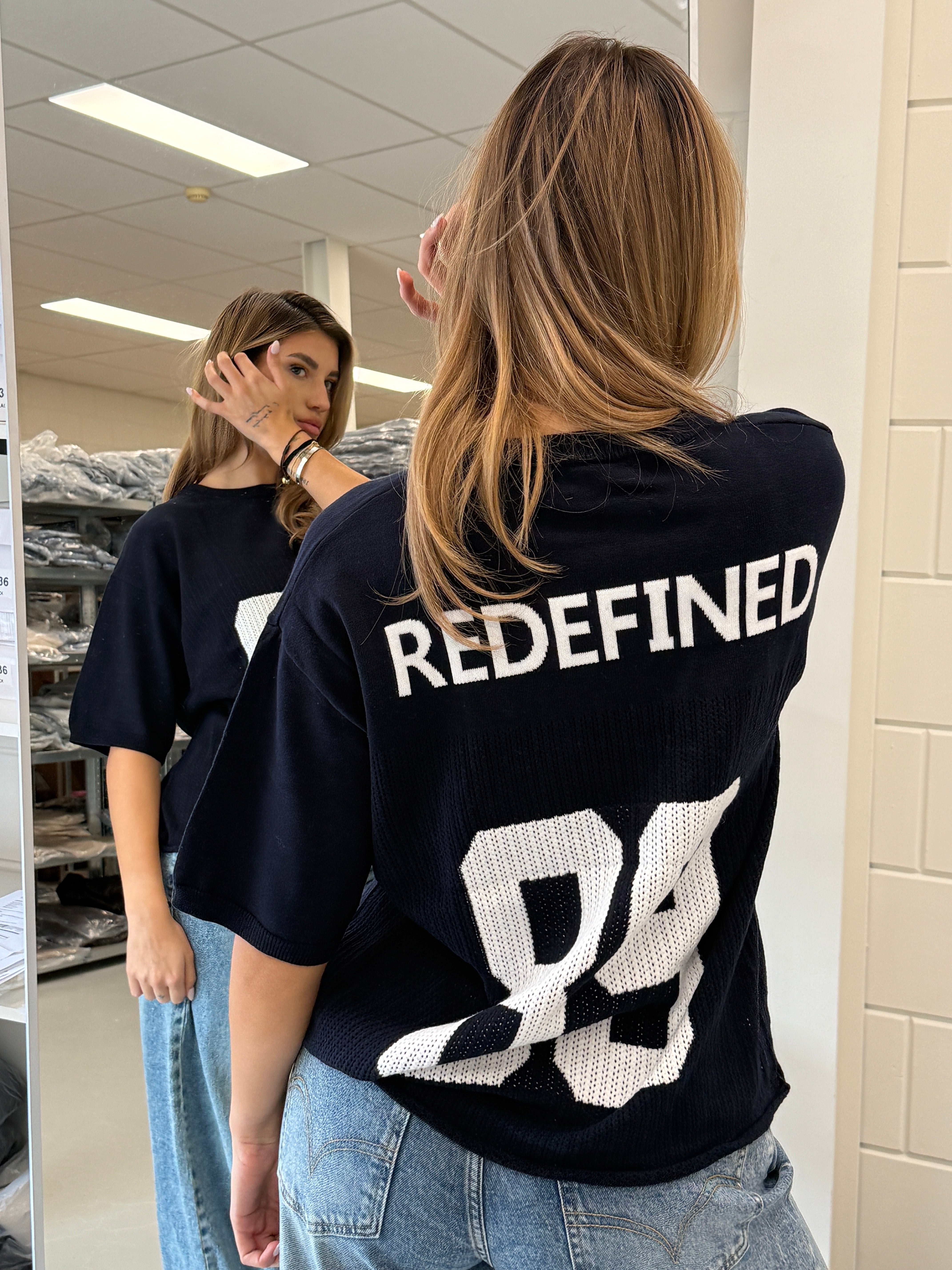 de knit jersey is one size en past het beste bij maat XS t/m L. Teddy is 175 en draagt normaal M.