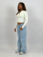 De top valt op maat. Het model draagt maat S/M.