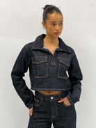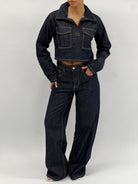 Hoe leuk is deze denim top?! Dit is de perfecte match met onze mid waist dark stretch denim.